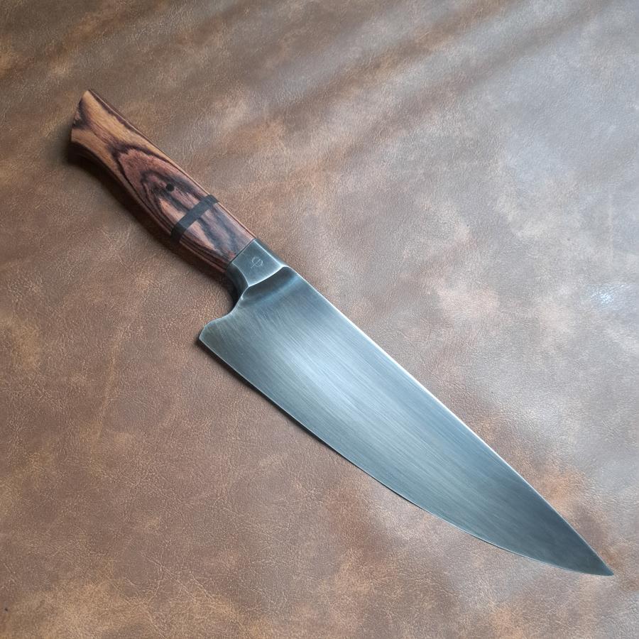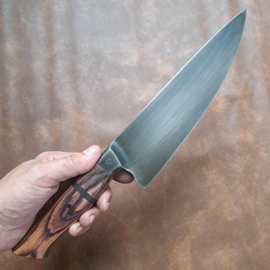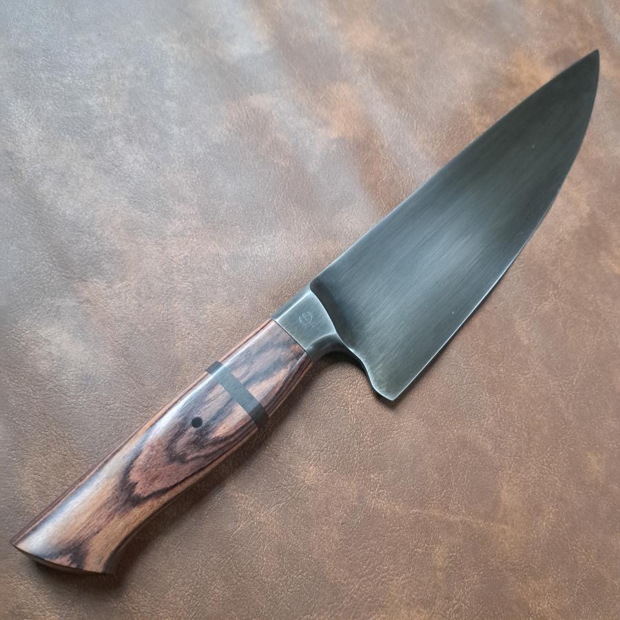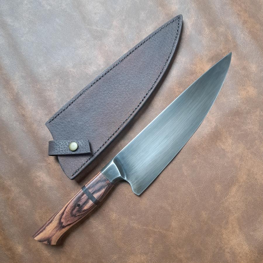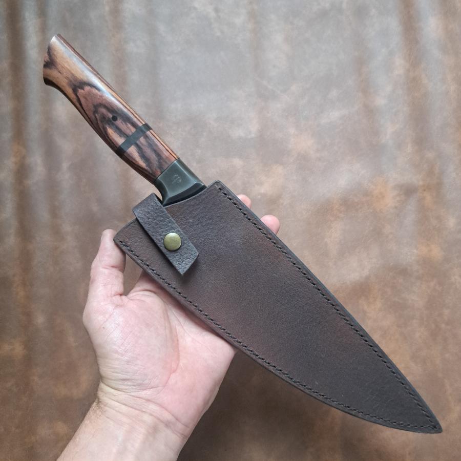 Integral chef knife, blade forged from 1075 steel. Purpleheart handle, carbon fiber pin. Buffalo leather sheath, hand-stitched.